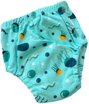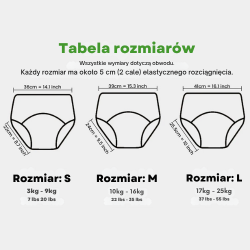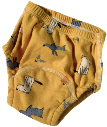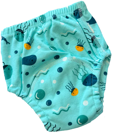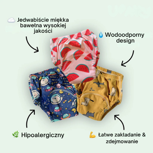 - Wewnętrzna warstwa bawełny przekazuje wilgoć bezpośrednio na skórę dziecka, co daje natychmiastowy sygnał „jestem mokry” — odwrotnie niż w pieluchach, które odciągają wilgoć.
